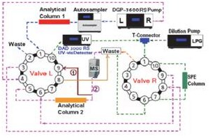 二维或多维色谱分离的实现往往需要复杂仪器系统的配置和管路连接,并需要软件的繁琐设置和支持,这些因素极大地制约了二维或多维色谱分离技术的应用。赛默飞UltiMate 3000 DGLC 双三元液相色谱,使这些变得不再是问题。二维色谱分离,样品从左泵进样后在一维色谱柱中实现初步分离净化,去除基质干扰物质,然后分别将目标分析物中心切割至SPE 小柱中浓缩,最后通过右泵的流动相体系将SPE 柱中的目标物洗脱至第二维的分析柱中进行分析测定。