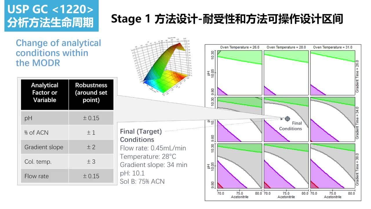 阶段 1 的目标是设计一种耐用的分析方法,结果应符合ATP中描述的质量属性(偏差和精度),从而导至正确的产品质量评估。在此阶段应用AQbD概念是实现分析方法产生可报告价值的理想质量的关键。AQbD的目标是设计一种始终满足ATP的分析方法,以有效控制原料药和制剂的CQA。