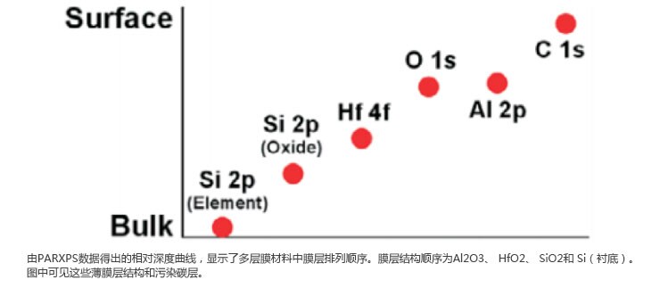 简单地应用角分辨XPS数据可得到相对深度曲线,可显示样品中膜层的排列顺序,但没有提供厚度和深度信息。