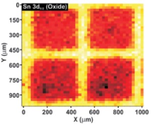 Theta Probe用X射线束斑限定分析面积(即源限定SAXPS)。横向分辨15 µm 至 400 µm。在X射线束斑下通过移动样品台进行扫描化学成像。所以,X射线束斑大小决定了图像的分辨。通过扫描样品台成像,速度没有其它方法快,但是具有多项重要优点。