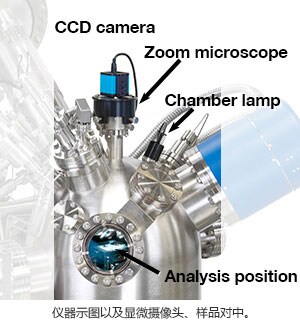 显微摄像头迅速在样品上方定位,显微摄像头的轴与样品处于分析位置时的法向方向平行。光学系统的视场范围400 µm 至 4 mm。当光学像聚焦清楚后,分析位置与标识线的中心位置精确对中。为了对中分析特征位置,必须在标识线的中心聚焦清楚样品特征,可用轨迹球或鼠标指向光学图像完成样品定位。