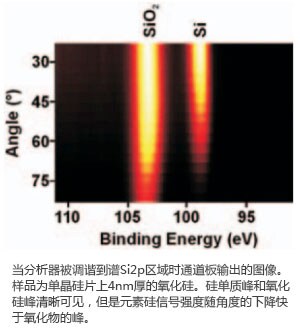 当分析器被调谐到谱Si2p区域时通道板输出的图像。样品为单晶硅片上4nm厚的氧化硅。硅单质峰和氧化硅峰清晰可见,但是元素硅信号强度随角度的下降快于氧化物的峰。