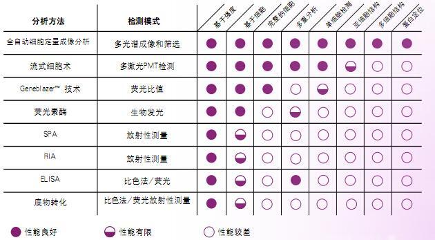 自动细胞定量成像分析是一种成熟的技术,可以检测细胞水平的信号强度和形态学变化,适用于完整细胞、固定细胞和活细胞。与实验室常用的几种细胞分析法相比,自动细胞定量成像分析有着无可比拟的优势(见下表)。