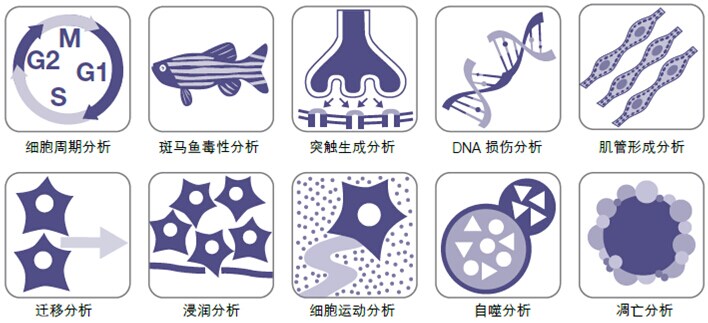 自动细胞定量成像分析的应用范围非常广泛,涵盖了肿瘤学、免疫学、毒理学、药学、神经生物学、组织学等多个领域,比如细胞健康和毒性分析、肿瘤/癌症分析、信号通路分析、神经学分析等等。(欲知详情,请下载《Cellomics应用集锦》)
