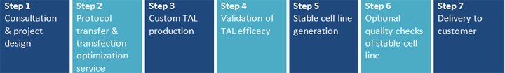 We will apply its expertise in creating stable cell lines to design, develop, and validate a custom stable cell line as outlined below using validated GeneArt Precision TALs and a customer-supplied cell line.