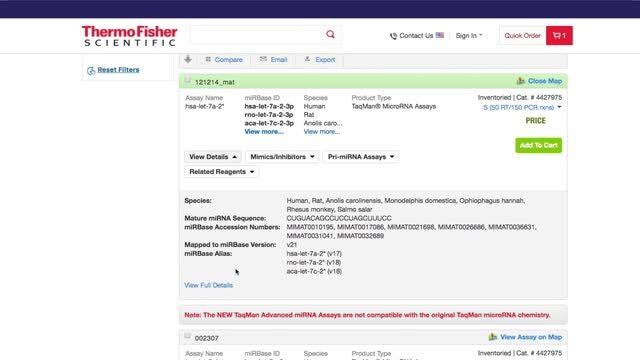 标准 TaqMan MicroRNA 测定试剂盒和新型 TaqMan Advanced miRNA 测定试剂盒的内容与 miRBase 数据库22版保持一致。关于标准 TaqMan MicroRNA 测定试剂盒、TaqMan Advanced miRNA 测定试剂盒和其他技术资源的完整列表,请访问 TaqMan MicroRNA 测定试剂盒资源页面。