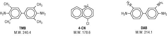 Another widely used HRP substrate is 3, 3'-diaminobenzidine (DAB), which has a molecular weight of 214.1 and yields a brown precipitate in the presence of HRP and peroxide. The brown, insoluble product can be readily chelated with osmium tetroxide. This property makes DAB ideal for electron microscopy. The color produced by DAB can be intensified with the addition of metals such as nickel, copper, silver and cobalt that form complexes. The color produced by the metal complexes is darker than the color produced by DAB alone, enhancing the sensitivity in staining applications.