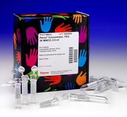 Thermo Scientific™ Pierce蛋白浓缩管采用低蛋白吸附的聚醚砜(PES)膜进行生物样品的浓缩、脱盐和缓冲液置换。可提供四种体积规格(0.5 mL、6 mL、20 mL和100 mL),并涵盖多种截留分子量(3K、5K、10K、30K、50K和100K MWCO)。