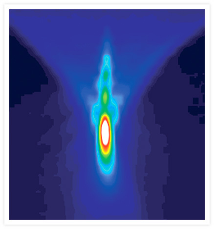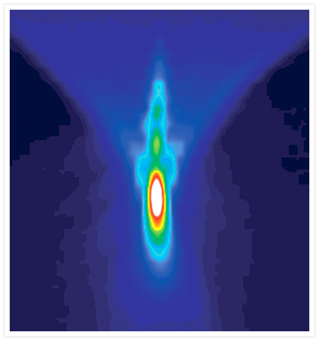 An orthogonal (x-z) display representing a microscope point-spread function. The microsphere used is a component of the PS-Speck™ Microscope Point Source Kit (Cat. no. P7220). This pseudocolored image was generated electronically from a series of microsphere images taken in x-y planes. The image was contributed by Jennifer Kramer, Scanalytics.
