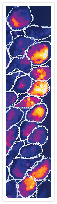 Spontaneous intracellular Ca2+ fluctuations of neurons developing in vivo. The spinal cord was dissected from a neurula-stage Xenopus embryo and loaded with fluo-3 AM (Cat. no. F1241, F1242, F14218, F14242, F23915). Regions of fluo-3 fluorescence on the ventral side of the spinal cord are presented pseudocolored in gold and indicate areas of highest intracellular Ca2+ (Nature 375, 784 (1995)). The image was obtained with a Bio-Rad MRC600 confocal laser-scanning microscope. The image was contributed by Nicholas C. Spitzer, University of California, San Diego.