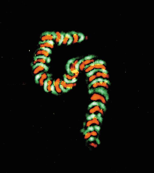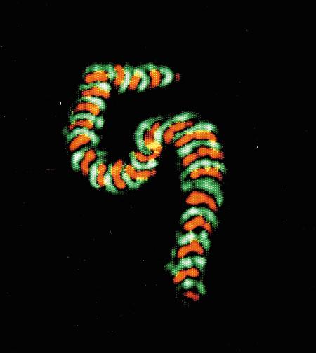 Unlabeled neutrophils that have been allowed to migrate spontaneously in gelatin matrices containing a prototype of DQ Green BSA (D12050) and dihydrotetramethylrosamine. Extracellular release of reactive oxygen metabolites oxidizes dihydrotetramethylrosamine to tetramethylrosamine, yielding orange fluorescence. Extracellular protease activity cleaves highly quenched DQ Green BSA, yielding green-fluorescent peptides. The micrograph illustrates an alternating pattern of orange and green fluorescence and shows that extracellular release of oxidants and proteolytic activity oscillate 180° out of phase during cell locomotion. Image contributed by Howard R. Petty, Wayne State University.