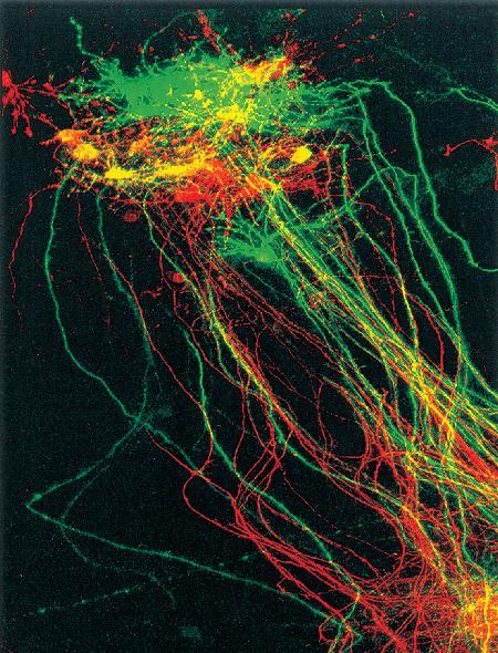 Pseudocolored confocal microscope image of retrogradely labeled neurons in the ventrobasal nucleus of the thalamus in newborn mouse. Paired dye deposits of DiI (DiI18(3), D282, D3911; pseudocolored green) and DiD (DiIC18(5), D307, D7757; pseudocolored red) were injected into this 500 µm–thick section, which was then fixed with paraformaldehyde and incubated for two weeks at 37°C to allow retrograde dye transport to proceed. Image contributed by Ariel Agmon, West Virginia University.