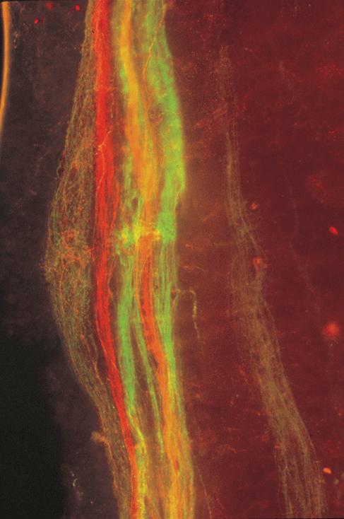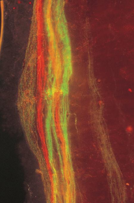 The antero-ventral and antero-dorsal lateral line nerves in an Ambystoma mexicanum whole-mounted brain after labeling with 3000 MW Rhodamine Green dextran (D7163) and lysine-fixable 3000 MW tetramethylrhodamine dextran (D3308), respectively. In both cases, the dextran was applied to the respective cut cranial nerves. This photomicrograph shows the four segregated ventral fascicles of the mechanosensory lateral line fibers and the intermingling of the dorsal electrosensory fibers. Image contributed by Bernd Fritzsch, Creighton University.