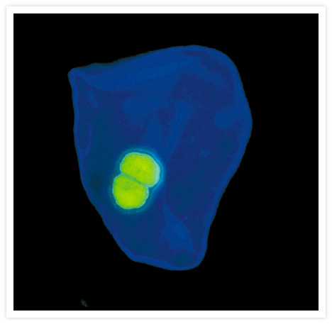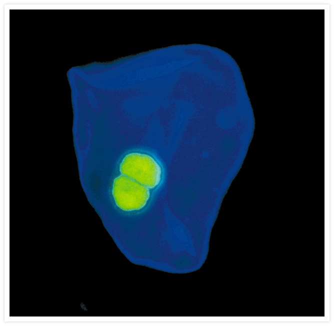 Human cheek epithelial cells labeled with Alexa Fluor® 350 wheat germ agglutinin (Cat. no. W11263) and stained with SYTOX® Green nucleic acid stain (Cat. no. S7020). This multiple-exposure image was acquired using bandpass filter sets appropriate for DAPI and fluorescein.