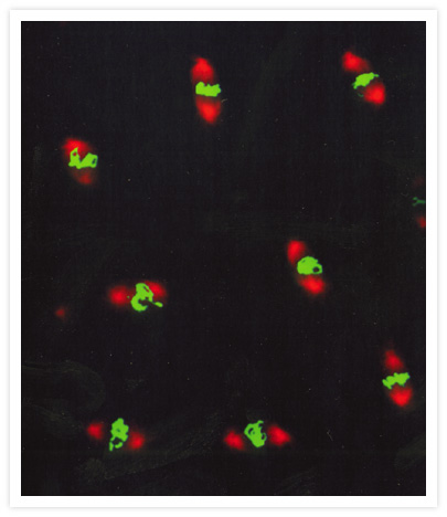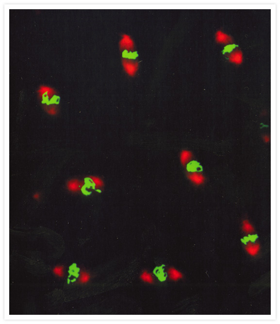 Mitotic divisions in early Drosophila embryos. The spindles were labeled with an anti–a-tubulin primary antibody and probed with a secondary antibody labeled with Lissamine rhodamine B sulfonyl chloride (Cat. No. L20, L1908). After a brief RNase treatment to reduce background fluorescence, the chromosomes were counterstained with SYTOX® Green nucleic acid stain (Cat. No. S7020). The image was contributed by Tulle Hazelrigg and Amy MacQueen, Columbia University.
