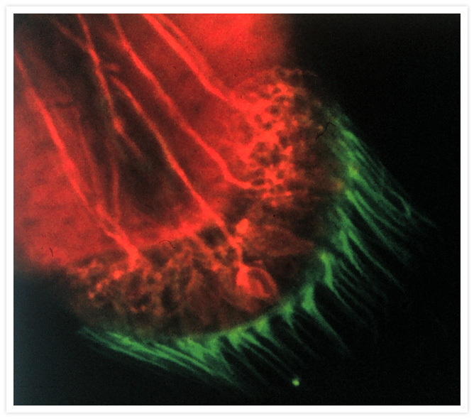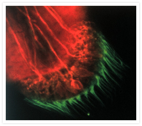 The attached eighth nerve from the vestibular labyrinth of a turtle, Pseudemys scripta, exposed to lysine-fixable 3000 MW tetramethylrhodamine dextran (Cat. no. D3308) and incubated with F-actin–specific BODIPY® FL phallacidin (Cat. no. B607). F-actin–labeled ciliary bundles were stained green by the phallacidin, and the calyceal and bouton endings of their primary afferents were stained red by the dextran. This image is a projection of 40 confocal images. Image contributed by Laura DiCaprio and Ellengene Peterson, Ohio University.