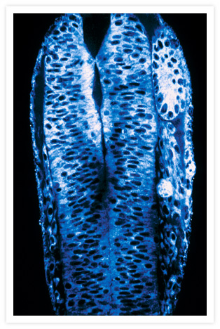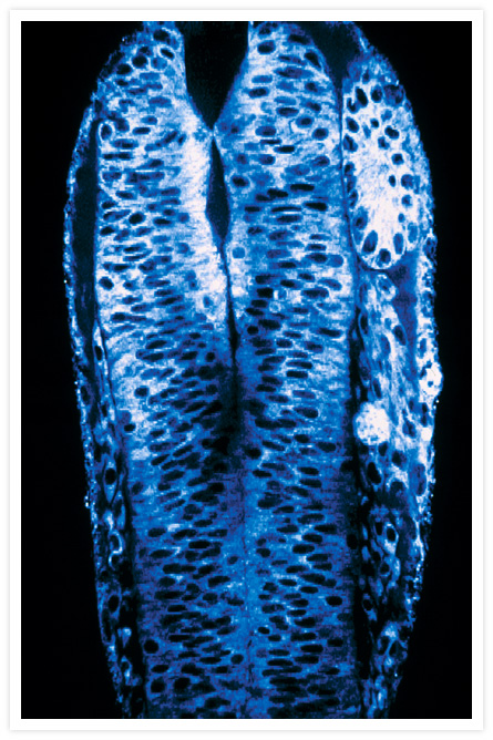 Dorsal view of the midbrain/hindbrain region of a 15-somite stage zebrafish embryo labeled with BODIPY® 505/515 (D3921). BODIPY® 505/515 localizes in lipidic yolk platelets, producing selective cytoplasmic staining. This pseudocolored confocal image was obtained using a Bio-Rad MRC-600 microscope. Image contributed by Mark Cooper, University of Washington.