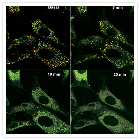 NIH 3T3 fibroblasts stained with JC-1 (T3168), showing the progressive loss of red J-aggregate fluorescence and cytoplasmic diffusion of green monomer fluorescence following exposure to hydrogen peroxide. Images show the same field of cells viewed before H2O2 treatment and 5, 10 and 20 minutes after treatment. The images were contributed by Ildo Nicoletti, Perugia University Medical School.