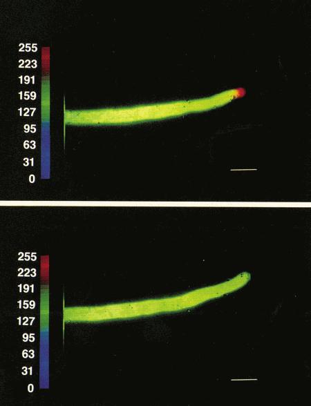 Top panel: Pseudocolored image of a pollen tube of Lillium longiflorum injected with fura dextran (Cat. No. F3029). The cell continues elongating and clearly shows a Ca2+ gradient.