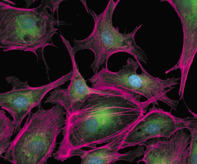 The subcellular structures in fixed and permeabilized bovine pulmonary artery endothelial cells are visualized with several fluorescent dyes. Filamentous actin (F-actin) was identified with Alexa Fluor 633 phalloidin (Cat. No. A22284), which is pseudocolored magenta. Lipophilic regions of the cell, including intracellular membranes, were stained with green-fluorescent DiOC6(3) (Cat. No. D273). Finally, nuclei were counterstained with blue-fluorescent DAPI (Cat. No. D1306, D3571, D21490). The image was acquired using filters appropriate for fluorescein and DAPI and a special filter (courtesy of Omega Optical) for the Alexa Fluor 633 dye, consisting of a narrow band exciter (630DF10), dichroic (640DRLP) and emitter (660DF10).