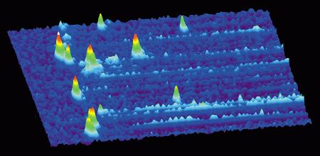 Confocal linescan image of calcium "puffs" in a Xenopus oocyte. Oregon Green 488 BAPTA-1 (O6806) was used as the calcium indicator and Ca2+ liberation was evoked by flash photolysis of NPE-caged Ins 1,4,5-P3 (I23580). Image contributed by Ian Parker and Nick Callamaras, University of California at Irvine.