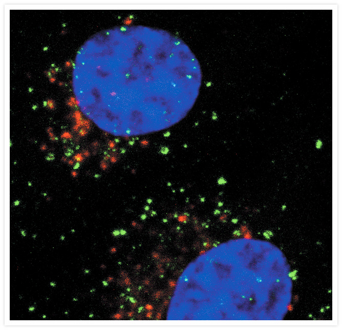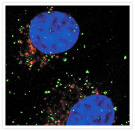 Early endosomes in live HeLa cells identified after a 10-minute incubation with green-fluorescent Alexa Fluor® 488 epidermal growth factor (Cat. no. E13345). The cells were subsequently fixed with paraformaldehyde and labeled with an antibody to the late endosomal protein, RhoB. That antibody was visualized with a red-orange–fluorescent secondary antibody. Nuclei were stained with TO-PRO®-3 iodide (Cat. no. T3605, pseudocolored blue). The image was contributed by Harry Mellor, University of Bristol.