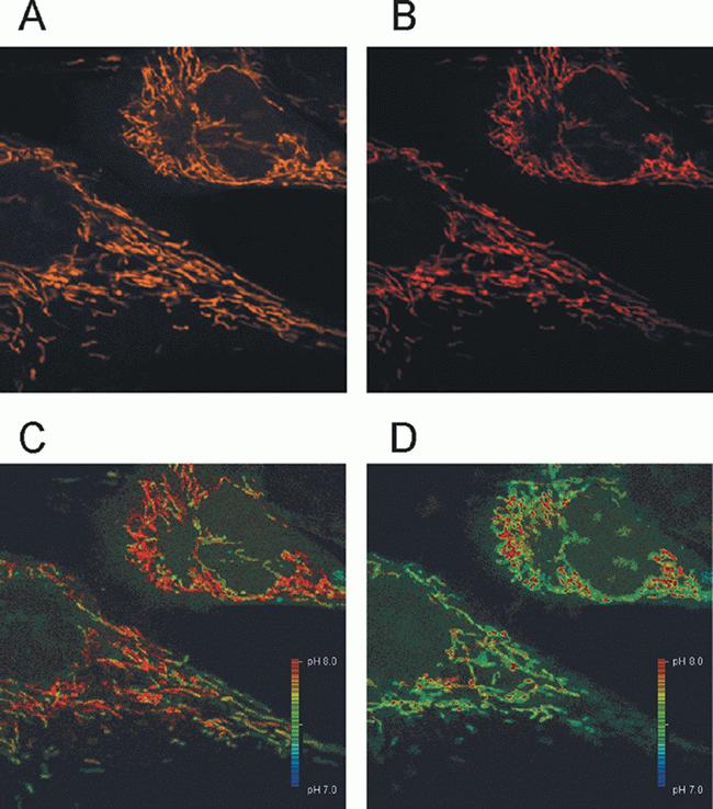 Selective loading of carboxy SNARF®-1 into mitochondria. BHK cells were loaded with 10 µM carboxy SNARF®-1, AM, acetate (Cat. no. C1271, C1272) for 10 minutes, followed by incubation for 4 hours at room temperature. A) Confocal image (488 nm excitation) of mitochondrial-selective loading of carboxy SNARF®-1 visualized through a 560–600 nm bandpass filter. B) Confocal image of the same cells as in A, but using a 605 nm dichroic mirror and a 610 nm longpass filter. C) Ratio image (A and B) of mitochondria in cells pseudocolored to represent different pH levels. D) Change in mitochondrial pH following the addition of 10 µM carbonyl cyanide m-chlorophenylhydrazone (CCCP), resulting in a decrease (acidification) of mitochondrial pH. Image contributed by Brian Herman, University of Texas Health Science Center, San Antonio, and reprinted with permission from Biotechniques 30, 804 (2001).