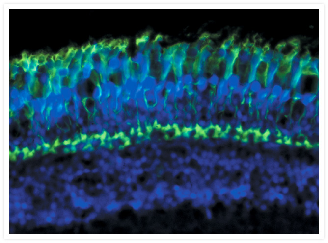 A zebrafish retina cryosection labeled with the mouse monoclonal antibody FRet 43 and detected using TSA Kit #2 with the HRP conjugate of goat anti–mouse IgG antibody and green-fluorescent Alexa Fluor® 488 tyramide (Cat. no. T20912). The nuclei were counterstained with blue-fluorescent Hoechst 33258 (Cat. no. H1398, H3569, H21491).
