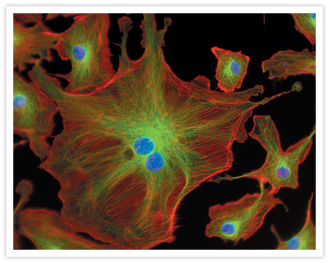 FluoCells prepared slide #2 (Cat. no. F14781), which shows bovine pulmonary artery endothelial cells (BPAEC) that have been stained with an anti–ß-tubulin mouse monoclonal antibody in conjunction with BODIPY FL goat anti–mouse IgG (Cat. no. B2752) for labeling microtubules, Texas Red-X phalloidin (Cat. no. T7471) for labeling F-actin and DAPI (Cat. no. D1306, D3571, D21490) for labeling nuclei. This multiple-exposure image was acquired using bandpass optical filter sets appropriate for DAPI, fluorescein and Texas Red dye.