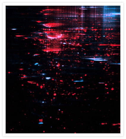 Visualization of total protein and phosphoproteins in a 2D gel. Proteins from a Jurkat T-cell lymphoma line cell lysate were separated by 2D gel electrophoresis and stained with Pro-Q Diamond phosphoprotein gel stain (P33300, P33301, P33302, blue) followed by SYPRO Ruby protein gel stain (S12000, S12001, S21900, red). After each dye staining, the gel was imaged on an FLA-3000 scanner (Fuji). The digital images were acquired using Z3 software (Compugen), and the resulting composite image was digitally pseudocolored and overlaid.