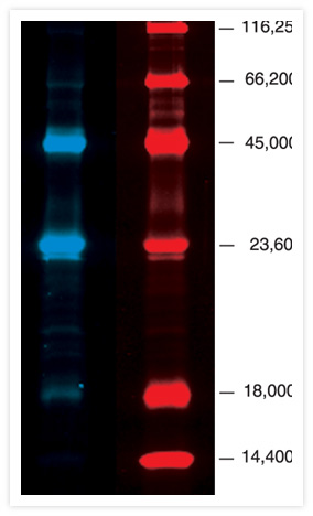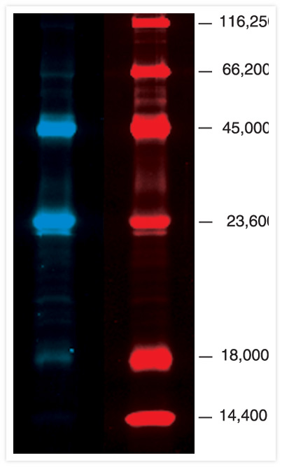 PeppermintStick phosphoprotein molecular weight standards (P33350, P27167) separated on a 13% SDS polyacrylamide gel. The markers contain (from largest to smallest) ß-galactosidase, bovine serum albumin (BSA), ovalbumin, ß-casein, avidin and lysozyme. Ovalbumin and ß-casein are phosphorylated. The gel was stained with Pro-Q Diamond phosphoprotein gel stain (blue) followed by SYPRO Ruby protein gel stain (red). The digital images were pseudocolored.