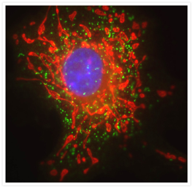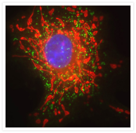 Peroxisomes were labeled using an antibody directed at peroxisomal membrane protein 70 (PMP-70) and detected with Alexa Fluor® 488 dye–labeled goat anti–mouse IgG secondary antibody. Mitochondria were stained with MitoTracker® Red CMXRos (Cat. no. M7512) prior to fixation; nuclei were stained with blue-fluorescent DAPI (Cat. no. D1306, D3571, D21490).
