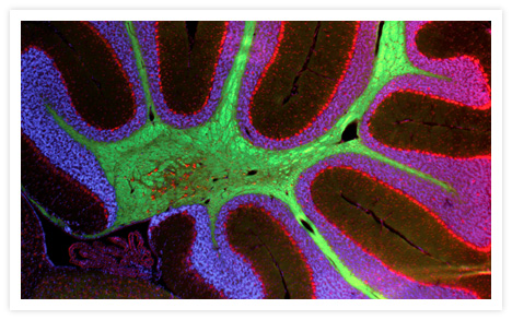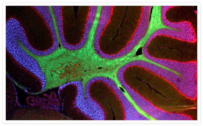Mouse cerebellum cryosection stained with reagents from the BrainStain™ Imaging Kit (B34650). Neuronal cell bodies were stained with NeuroTrace® 530/615 red-fluorescent Nissl stain, white matter was stained with FluoroMyelin™ Green dye, and nuclei were stained with DAPI.