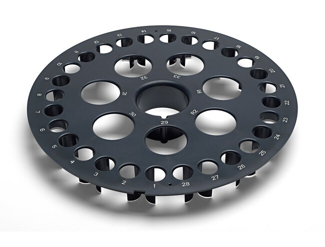 自行安装后,Dionex ASE 350 收集托盘可容纳多达 19 个收集瓶 (250mL) 和 2 个冲洗瓶。安装 Dionex ASE 350 托盘插件后,收集托盘在外排可容纳多达 28 个收集瓶 (60mL),在内排可容纳 5 个收集瓶 (250mL) 和 2 个冲洗瓶。
