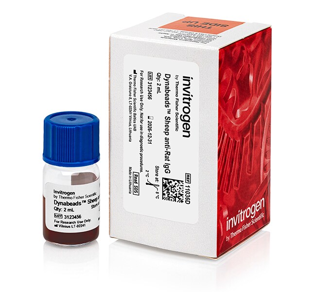 The rat primary antibody may be added to the cell sample (indirect technique) or pre-coated onto the Dynabeads Sheep Anti-Rat IgG (direct technique). Regardless of which technique is used, when the cell sample and the Dynabeads Sheep Anti-Rat IgG are mixed, the beads bind to the target cells. Placing the sample on a magnet separates the bead-bound cells from the rest of the sample. One or more rat primary antibodies may be used to either deplete the sample of unwanted cells (negative isolation) or to capture specific cells for molecular downstream experiments (positive isolation). For positive isolation of bead-free cells (e.g., for flow cytometry), we recommend using your rat antibody in combination with the Dynabeads FlowComp Flexi Kit.