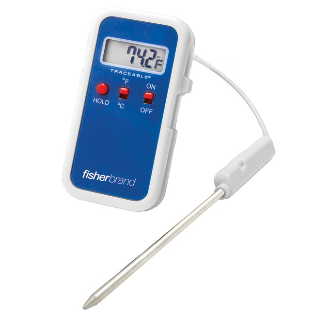 易于读取的数字式温度计设计紧凑,可手持或安装在受限区域的墙壁上。带有不锈钢探头的 Fisher Scientific™ 数字式温度计具有耐大多数酸、碱和溶剂的化学特性,可用于测量气体、液体、食品和其他半固体的温度。