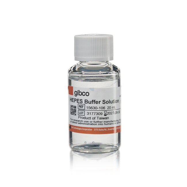 Gibco HEPES (4-(2-hydroxyethyl)-1-piperazineethanesulfonic acid) is a zwitterionic organic chemical buffering agent commonly used in cell culture media. It is membrane impermeable, relatively stable, and has limited interference in key processes.