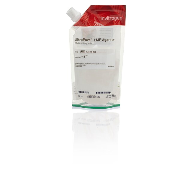 UltraPure™ Low Melting Point Agarose is a polysaccharide used for size-based separation of nucleic acids in agarose gel electrophoresis applications. UltraPure™ Low Melting Point Agarose is ideal for resolving DNA and RNA fragments larger than 1,000 bp and for the recovery of nucleic acid fragments after electrophoresis, as it melts at 65.5°C (below the melting point of most nucleic acids). The solution remains fluid at 37°C and will set rapidly at temperatures below 25°C.