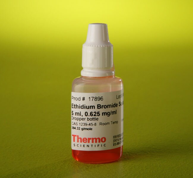 Thermo Scientific Pierce Ethidium Bromide is available as a dilute (0.625 mg/mL) solution to accommodate most molecular biology applications for fluorescent DNA visualization.