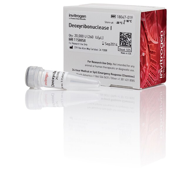 DNase I 以 1 样品瓶含 20,000 个单位规格提供,浓度为 50-375U/µL。在冷冻冰箱(-5°C 至 -30°C)中储存。