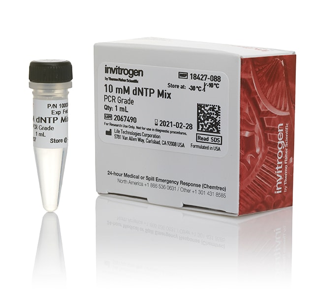 Invitrogen 10 mM dNTP 混合物是溶于 0.6 mM Tris-HCl 中的四种核苷酸 (dATP, dCTP, dGTP, dTTP) 的混合物。每种核苷酸浓度均为 10 mM。10 mM dNTP 混合物适用于聚合酶链式反应 (PCR)、测序、填充反应、切口平移、cDNA 合成和 TdT 加尾反应。