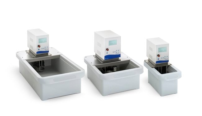 These economical open-bath circulators use water as the heat transfer liquid. Baths have integrated grips and supports and are fitted with bridge plates for placement of the control head.