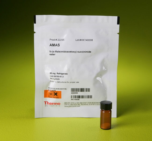 Thermo Scientific Pierce AMAS is an amine-to-sulfhydryl crosslinker that contains NHS-ester and maleimide reactive groups at opposite ends of a very short spacer arm (4.4 angstroms).