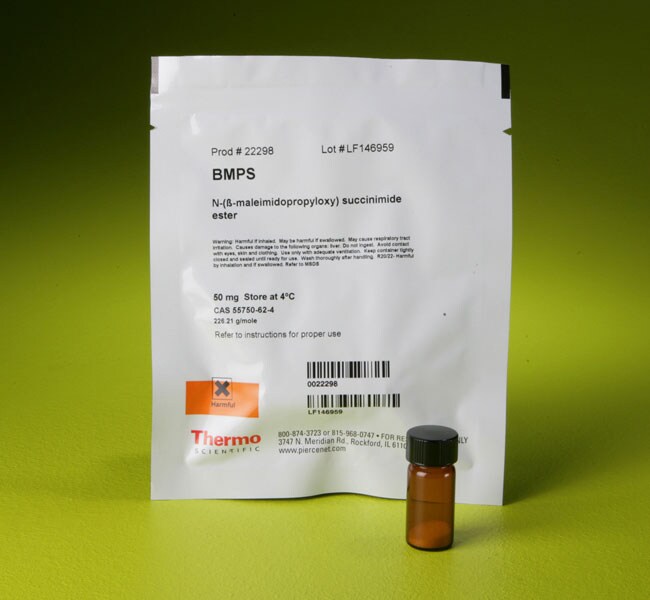 Thermo Scientific Pierce BMPS is an amine-to-sulfhydryl crosslinker that contains NHS-ester and maleimide reactive groups at opposite ends of a short spacer arm (5.9 Å).