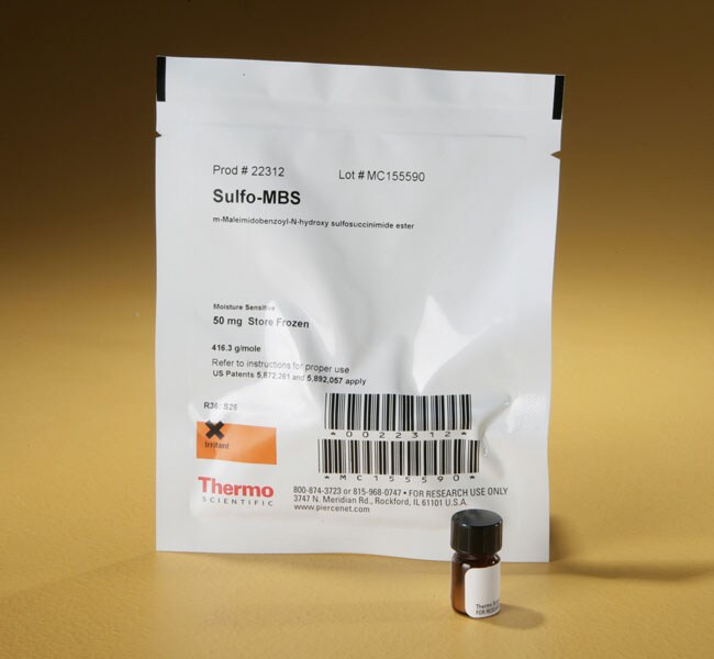 Sulfo-MBS (m-maleimidobenzoyl-N-hydroxysulfosuccinimide ester) is covered under our general 1-year warranty and is guaranteed to be fully functional for 12 months from the date of shipment, if stored as recommended. Please see section 8.1 of our Terms & Conditions of Sale (https://www.thermofisher.com/content/dam/LifeTech/Documents/PDFs/Terms-and-Conditions-of-Sale.pdf) for more details.