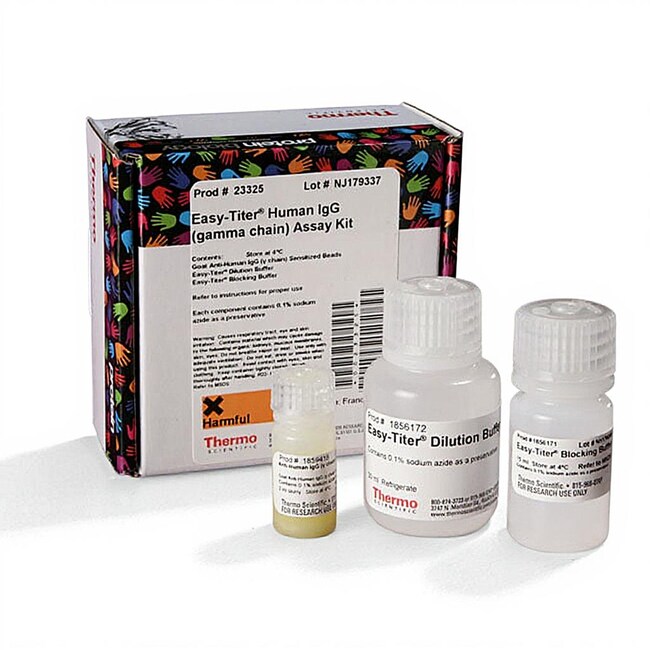 Thermo Scientific Easy-Titer 人 IgG(γ 链)检测试剂盒包括抗体敏化的微球,用于使用标准微孔板和 UV-Vis 微孔板读数仪(分光光度计)通过简单快速的微凝集技术测量抗体的特定浓度。该试剂盒对人 IgG γ 链具有特异性,且与总蛋白检测不同,它可特异性测量含有其他蛋白的样品(例如血清、血浆、培养物上清液)中的靶抗体浓度。该试剂盒灵敏,只需极少样品量。根据检测响应(吸光度),通过与使用已知抗体样品(单独出售)稀释液制备的标准曲线进行比较,确定抗体浓度。