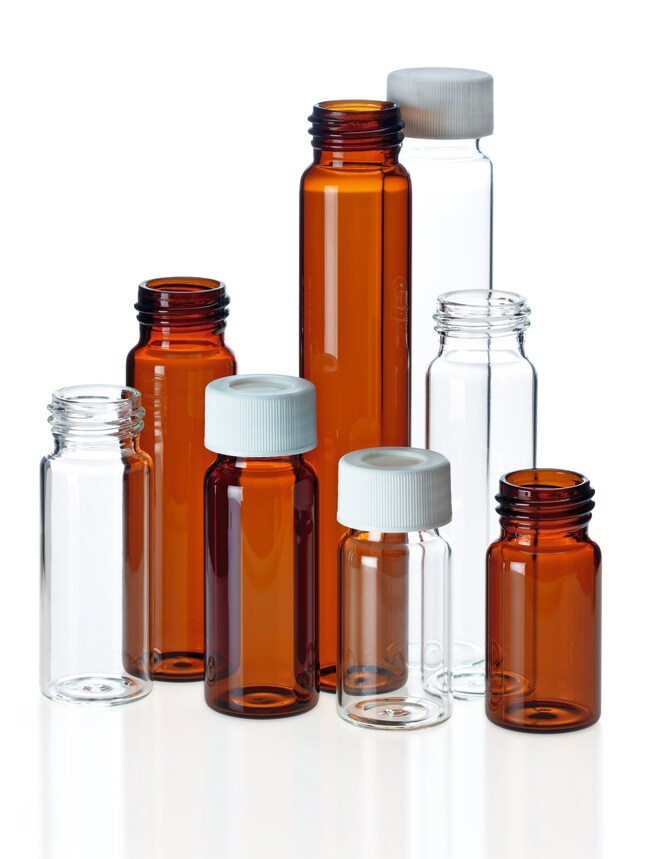 各种透明和琥珀色玻璃的 EPA 样品瓶。