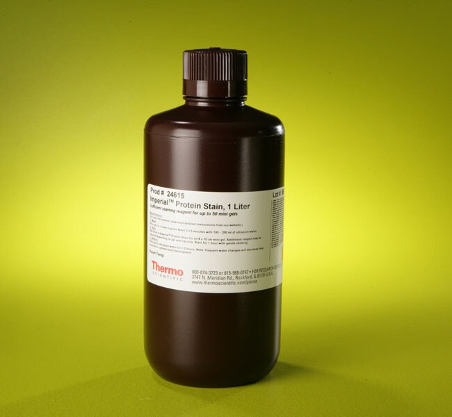 Imperial Protein Stain is a ready-to-use colorimetric stain formulated with coomassie dye R-250 that delivers consistent nanogram-level detection of proteins in polyacrylamide electrophoresis gels or nitrocellulose membranes.