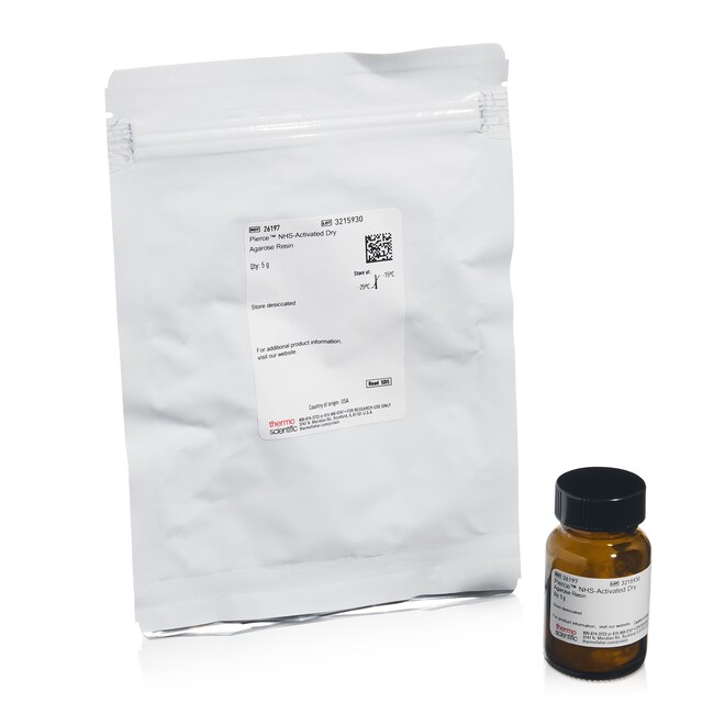 NHS- activated agarose reacts with primary and secondary amines to form stable amide and imide linkages respectively. Most proteins can be coupled in 30 mins with greater than 85% coupling efficiency. No hazardous chemicals are used, and the agarose is adaptable to use with spin columns, batch methods, or FPLC. The resin is resusable typically up to 10 purifications with the immobilized ligand, and has a high binding capacity (>30 mg/mL slurry or >25 mg/mL dry resin).