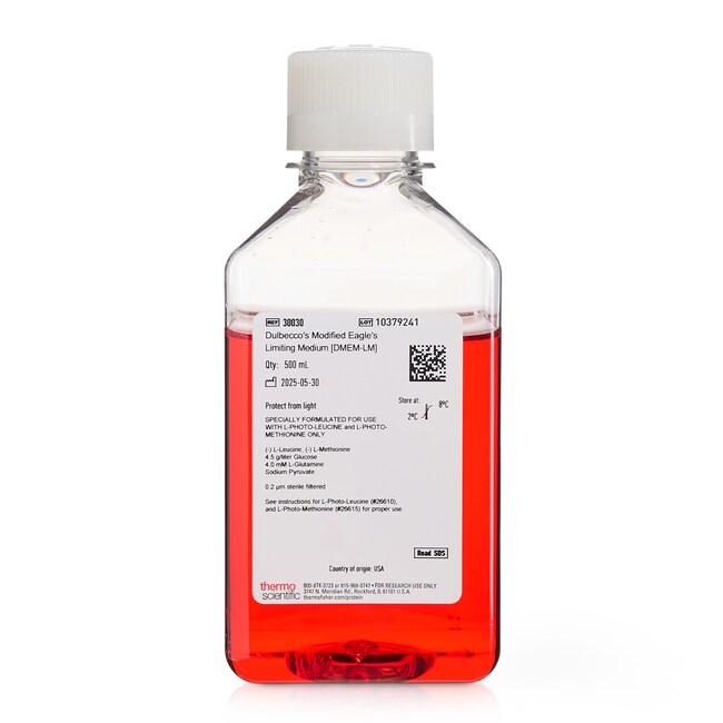 Long-term stability of the photoreactive amino acids in media has not been determined but should be comparable to their natural analogs, if protected from light. For best results, store the photoreactive amino acids at -20°C as a dry compound. Just before use, add the photoreactive amino acids to the minimal volume of DMEM-LM supplemented with dialyzed serum.